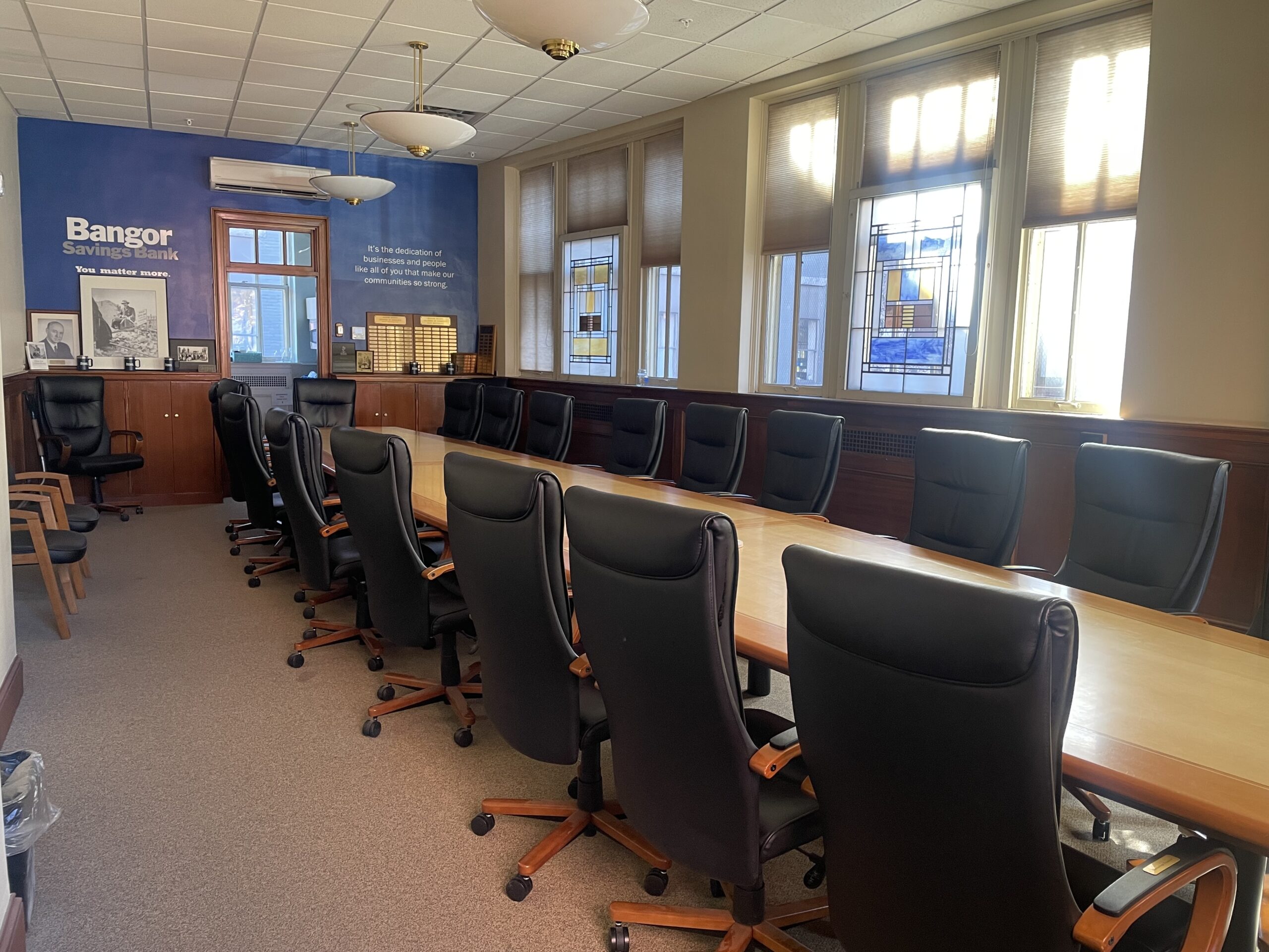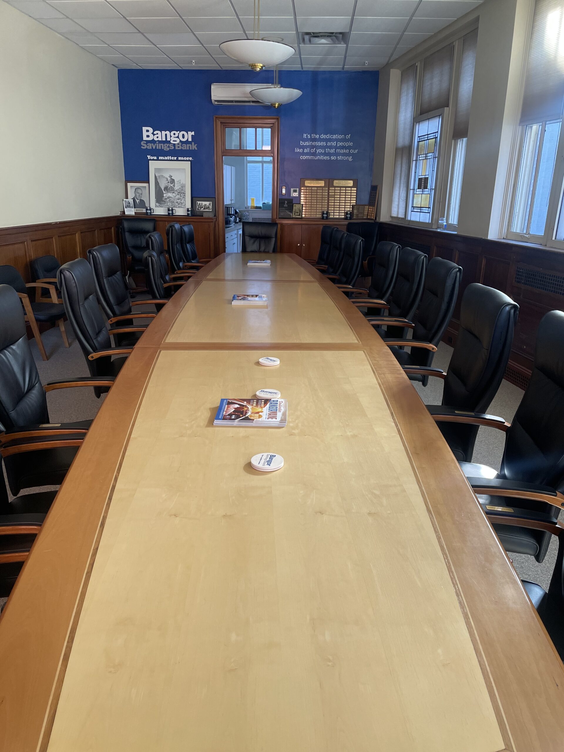 Bangor Savings Bank Boardroom – Seats 24, Executive Chairs, Long Table, TV Screen with HDMI